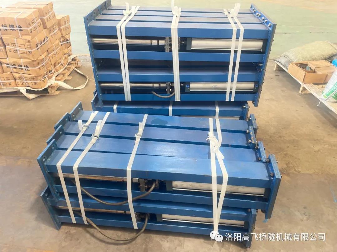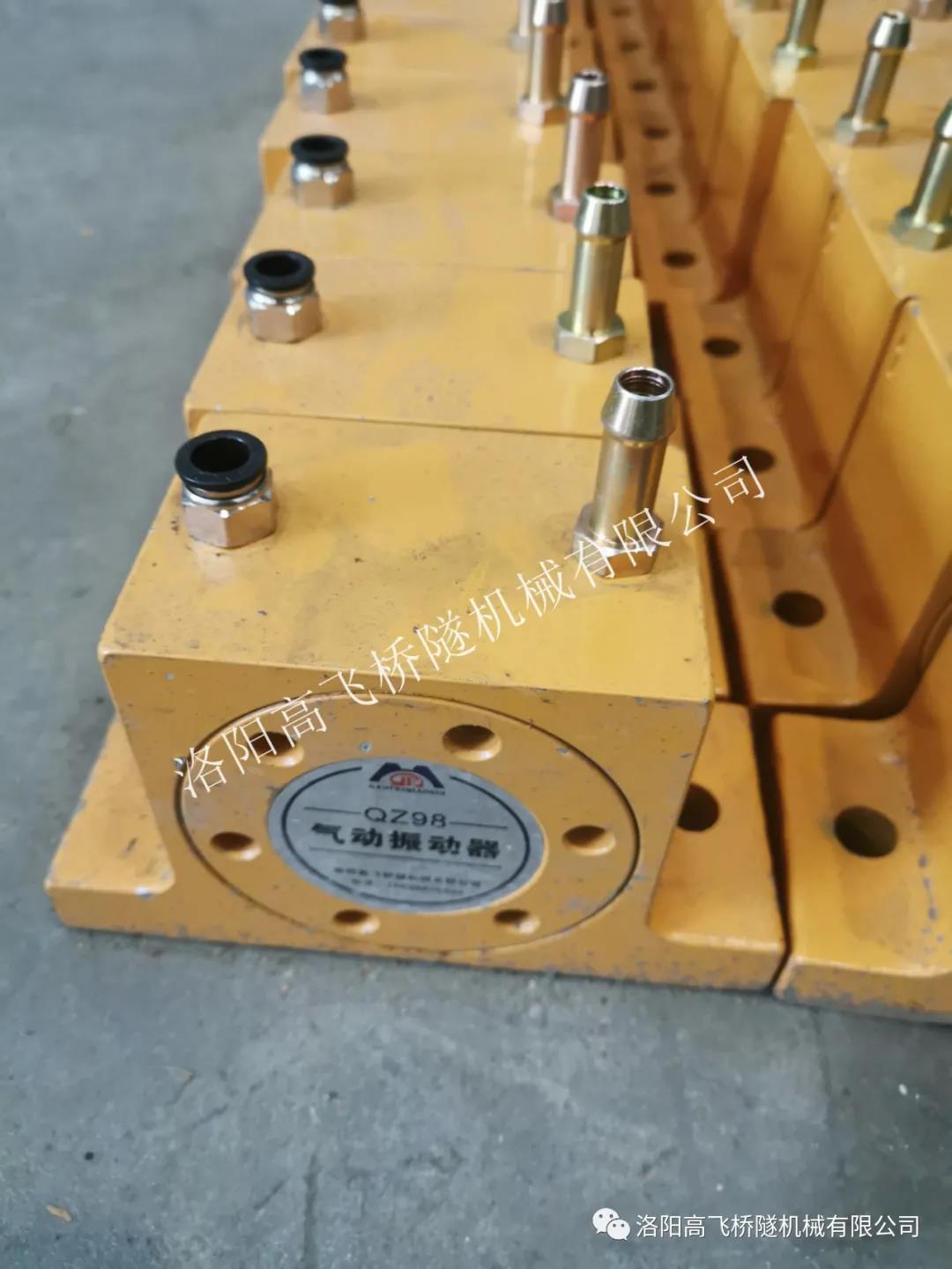 臺車配置8個插入式和32個附著式高頻自動振搗系統(tǒng),通過高壓氣體帶動高頻氣動振搗器工作,作業(yè)人員可通過PLC 程序控制持續(xù)振搗時間、間隔時間、振動次數(shù)。拱部插入式振搗系統(tǒng)通過插入式高頻振動器的往復(fù)運動,對拱部混凝土深部進(jìn)行充分振搗,實現(xiàn)環(huán)向、縱向及厚度方向的振搗全覆蓋,有效提升混凝土強(qiáng)度和密實度,可以從根本上解決隧道拱頂混凝土不密實導(dǎo)致脫空和空洞的難題。高頻氣動振動器,振動范圍廣、深度大,使混凝土振搗密實,整體提升隧道襯砌外觀質(zhì)量。