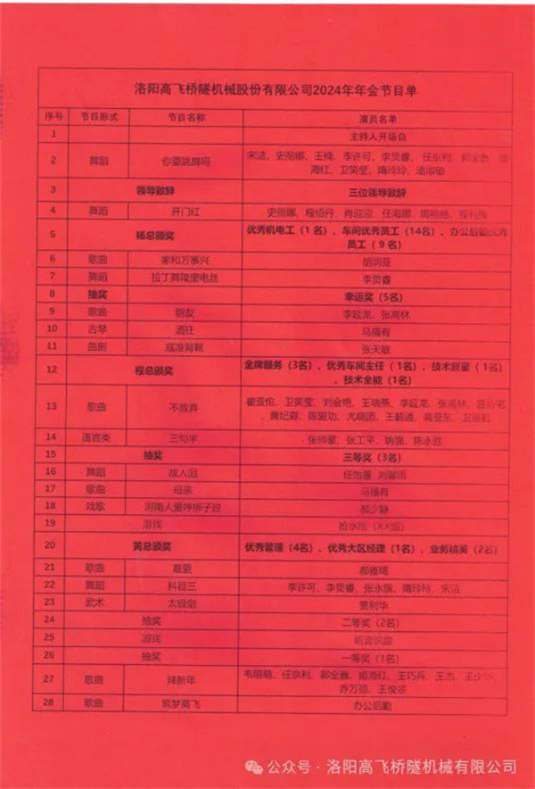 2024洛陽高飛橋隧機械股份有限公司年會在充滿活力與創意的表演中圓滿落幕。整個晚會展示了員工們卓.越的智慧和多樣的才藝,彰顯了團結、創新和共贏的精神。這一場難忘的盛會,也為接下來的相聚增添了絢麗的色彩。讓我們共襄盛舉,再創輝煌!